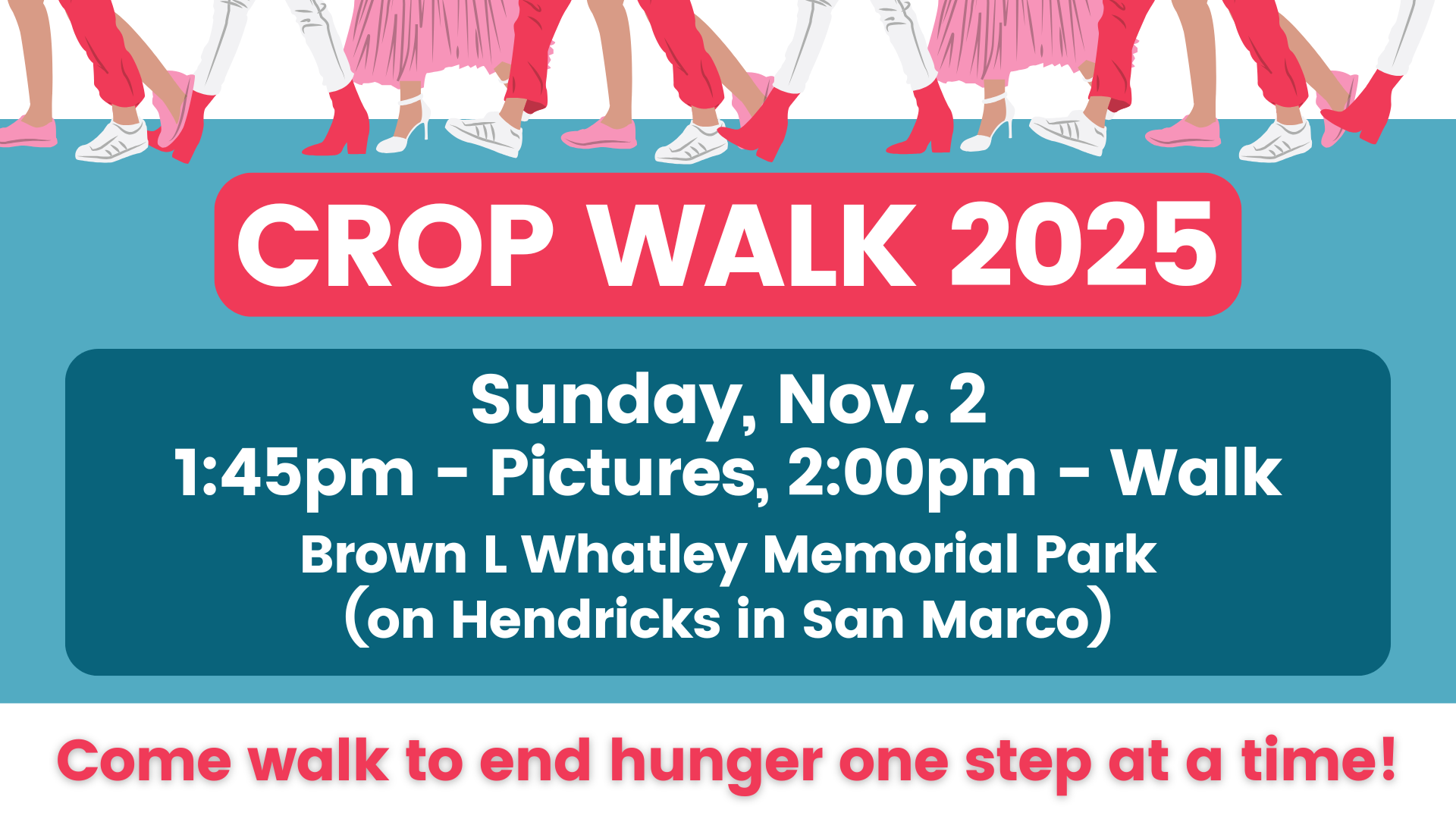 2pm - WalkCome join us at the Brown L. Whatley Memorial Park to end hunger one step at a time!