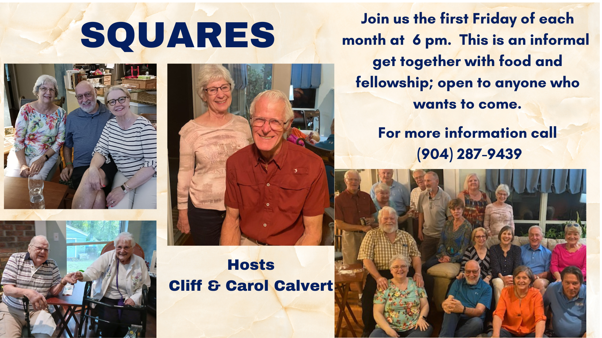 Squares is a fellowship group that meets on the first Friday of every month. All are welcome to meet new friends and get to know each other on a deeper level.