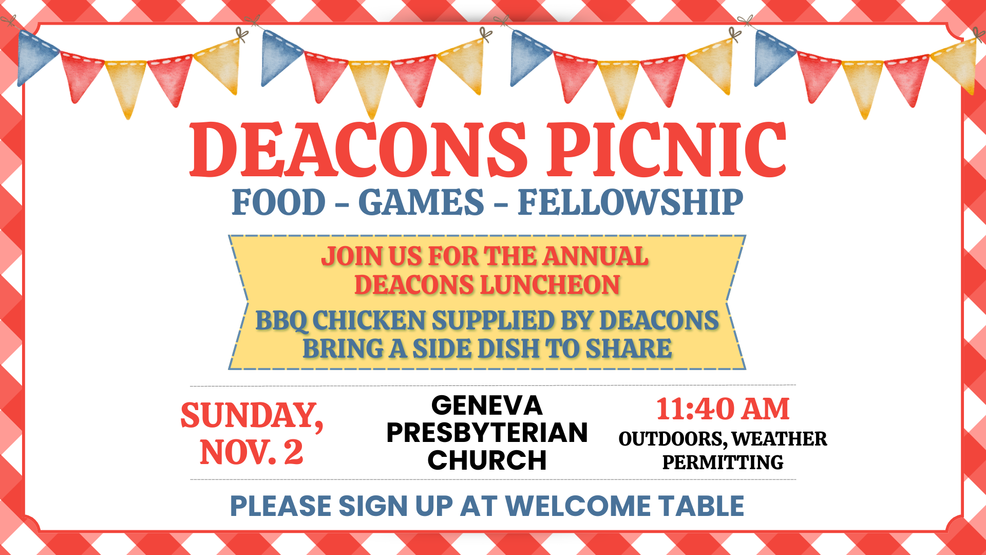 11:40amJoin us for the annual Deacons Luncheon! This year we will have the luncheon at Geneva, outdoors - weather permitting. BBQ chicken is provided, sign up to bring a side dish!